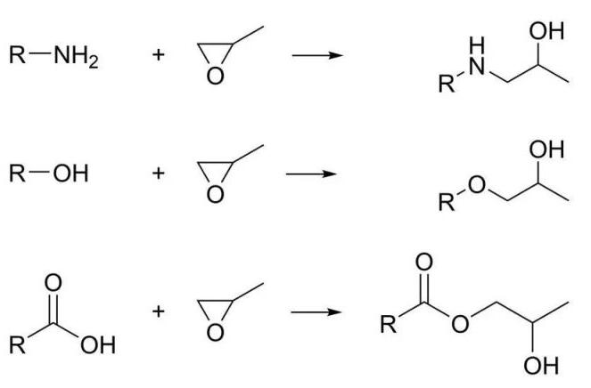 圖1 環氧基團和胺基、羧基、羥基的反應示意圖