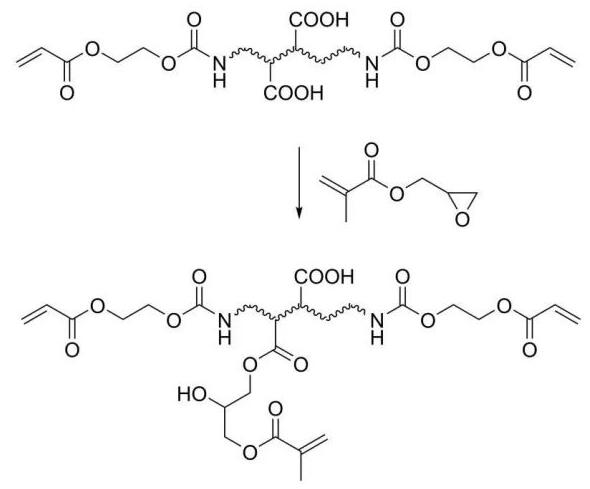 GMA可以通過多種合成路線用于UV光固化樹脂合成。一種方法是首先通過自由基聚合或縮合聚合,得到在側鏈上含有羧基或氨基的預聚體,然后再用GMA和這些官能基反應,引入感光基團從而得到光固化樹脂。在第一步共聚時,可以采用不同的共聚單體,從而得到最終性能各異的聚合物。馮宗財等人采用1,2,4-偏苯三酸酐和乙二醇反應合成超支化聚合物,再通過GMA引入感光基團,最終得到較好堿溶性的光固化樹脂。陸挺峰等人采用以聚己二酸-1,4-丁二醇酯、甲苯二異氰酸酯、二羥甲基丙酸和丙烯酸羥乙酯先合成具有感光活性雙鍵的預聚物,再通過GMA引入更多的可光固化雙鍵,經三乙胺中和,得到水性聚氨酯丙烯酸酯乳液。