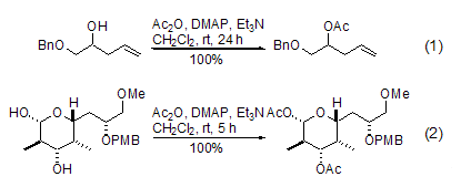 羥基的酰化反應(yīng)是有機(jī)化學(xué)中最重要和最頻繁的官能團(tuán)轉(zhuǎn)換反應(yīng)之一。很多情況下,使用酰化試劑和有機(jī)堿或者無機(jī)堿作為縛酸試劑可以方便地完成酰化反應(yīng)。但是,當(dāng)含羥基的底物分子中帶有多個官能團(tuán)存在時,特別是一些對酸或者溫度敏感的官能團(tuán)存在時,需要反應(yīng)具有較高的選擇性和在溫和條件下進(jìn)行。由于DMAP分子中二甲氨基上氮原子攜帶的孤對電子與芳環(huán)發(fā)生共振而增加了吡啶環(huán)上氮原子的親核性。所以DMAP作為一個酰化轉(zhuǎn)移試劑,比吡啶催化的酰化反應(yīng)速度快103~105 倍。一般來講,DMAP作為催化劑使用,催化用量在0.05~0.2 mol即可。多數(shù)DMAP催化的反應(yīng)可以在室溫下數(shù)分鐘至數(shù)小時內(nèi)完成,并給出很高的產(chǎn)率 (式1,式2)[3,4]。