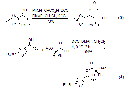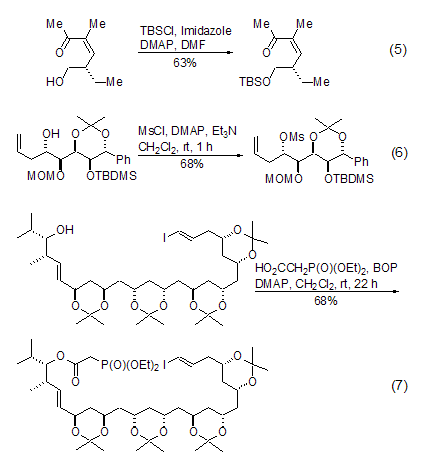 在DMAP的催化下,羥基在縮合試劑作用下直接酯化反應(yīng)的速度和產(chǎn)率均得到顯著提高。對于復(fù)雜的底物分子,相應(yīng)地也提高了反應(yīng)的選擇性。文獻(xiàn)報道的天然產(chǎn)物全合成路線中,四次用到了該反應(yīng) (式3,式4)[5,6]。