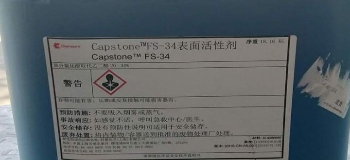 可穩䈬3定存在。由于在廣泛的pH值環境下皆穩定,Capstone™ FS-34系一款優異圜的、在各種水性體系中適用的潤濕流平劑。Capstone™FS-34可以減少電鍍槽式應用的帶出以改善電鍍效率;用于各種涂料配方中消除漆膜表面缺陷;亦用于清洗配方中以減少表面張力。